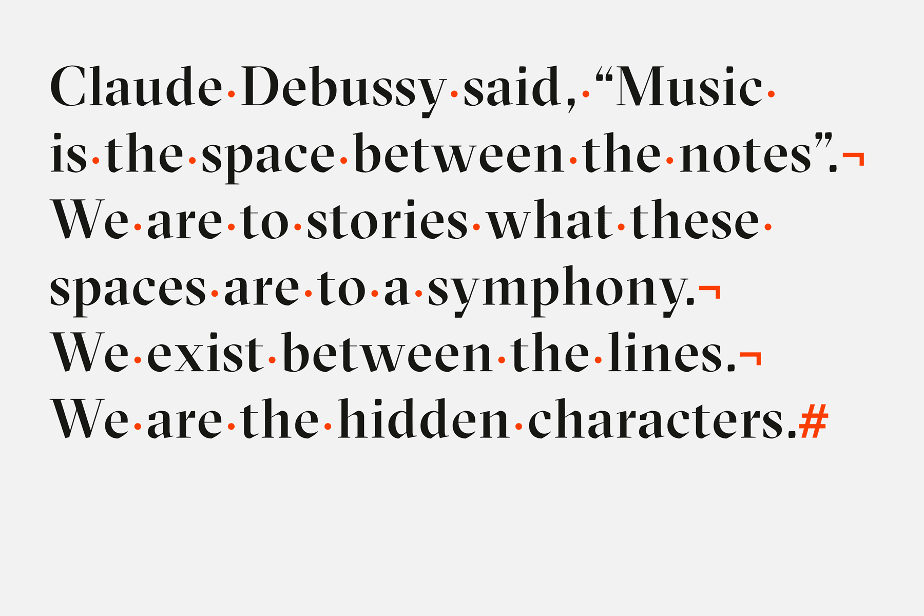 ‘Hidden Characters’ is a reference to the unseen typographic symbols in programs such as InDesign and Microsoft Word. These symbols shape how text appears in the same way that Hidden Characters works behind the scenes to carefully shape public perceptions of its clients’ brands.