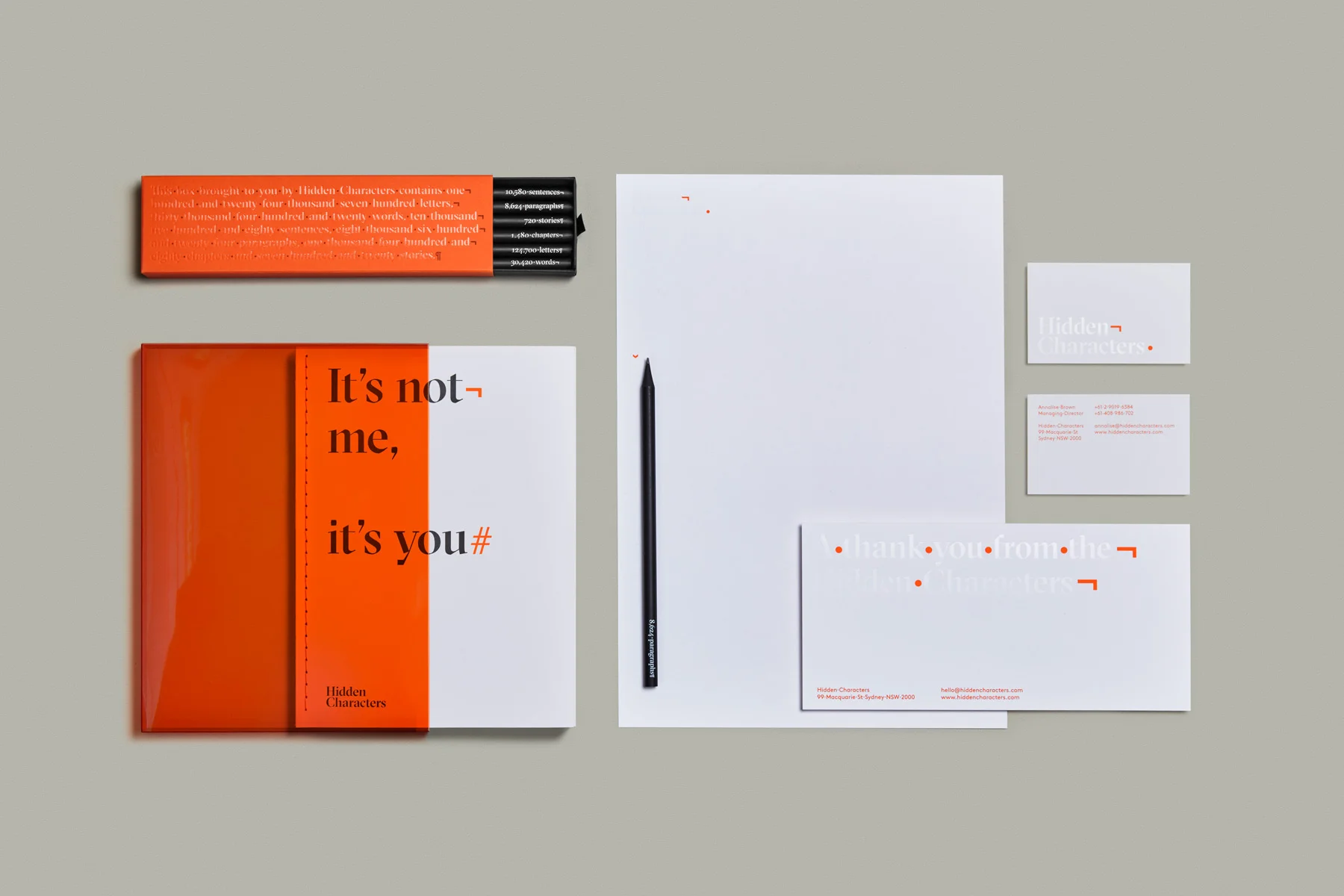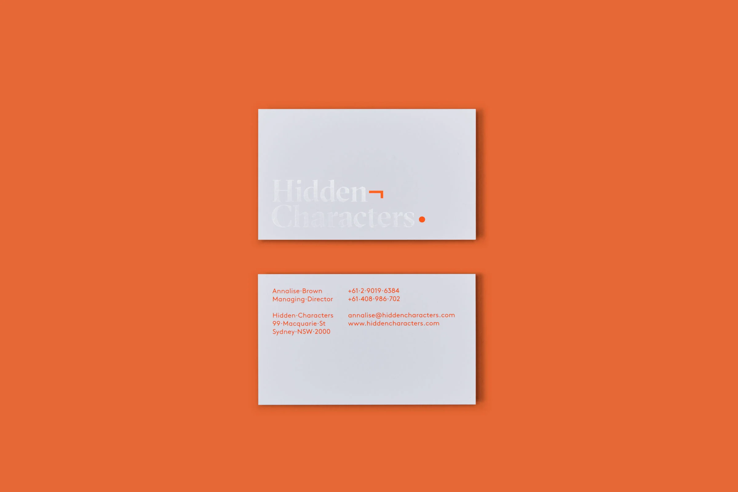 Brand applications play on the relationship between the seen and unseen using techniques such as French folded paper with text concealed inside, and clear gloss printing that renders text invisible in certain light. In this way the brand encapsulates Hidden Characters’ strategic engagement with media and influencers to address its clients complex communication challenges.
